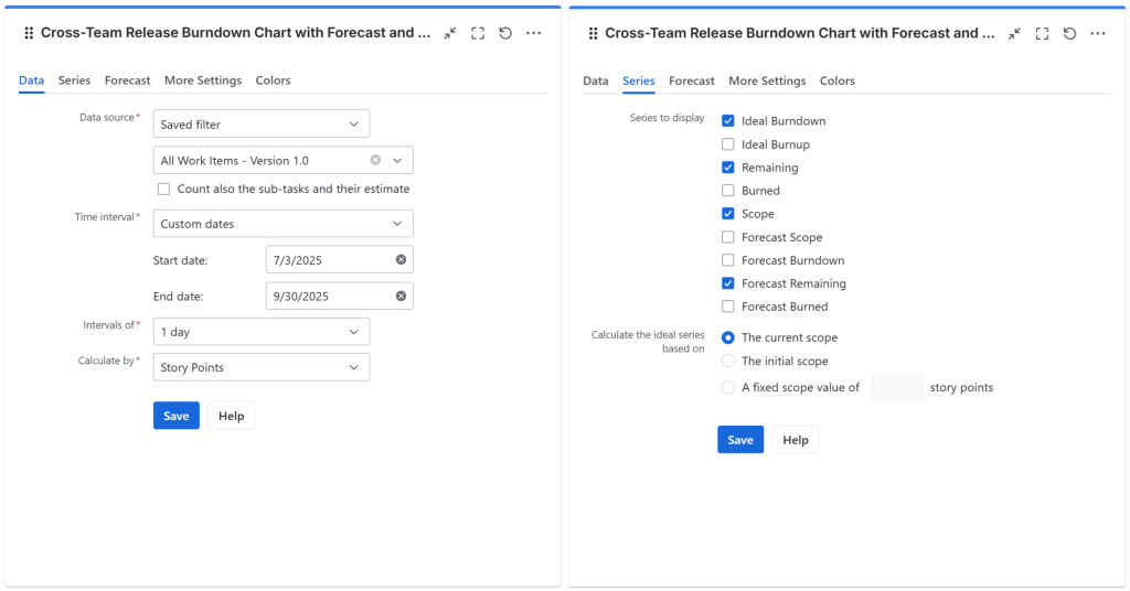 That’s all! Click Save. The gadget now displays the cross-projects or cross-teams burndown/burnup chart on your Jira Dashboard.