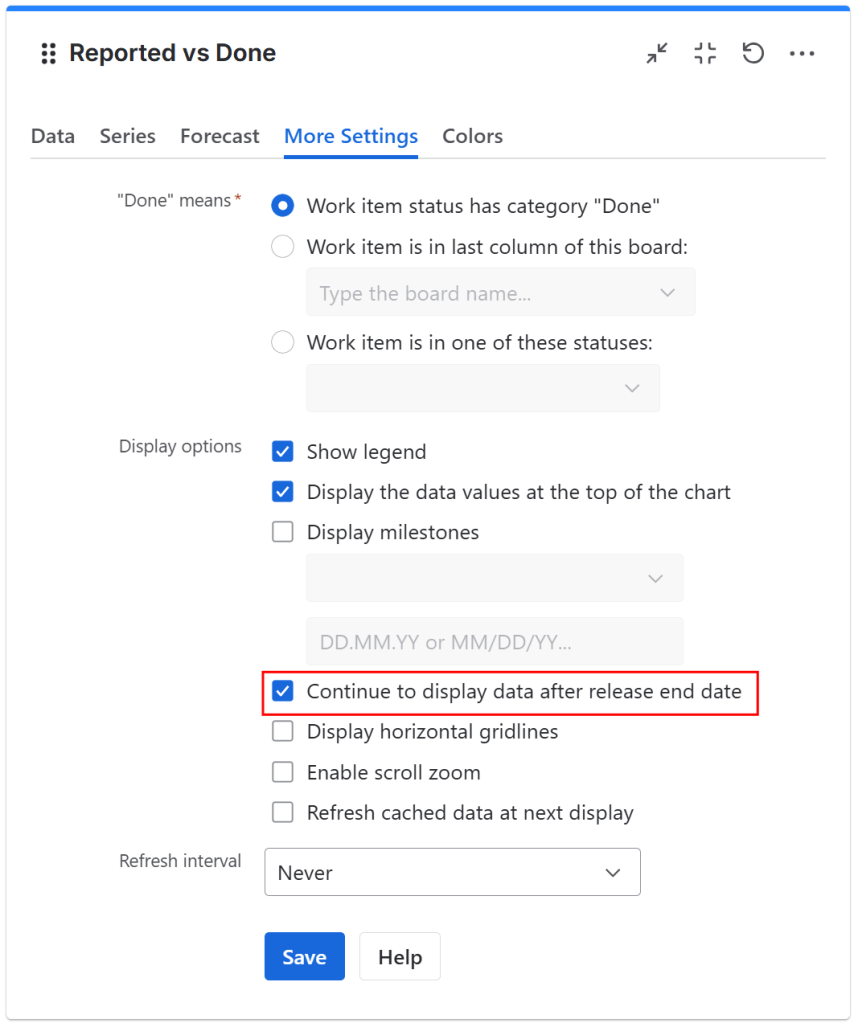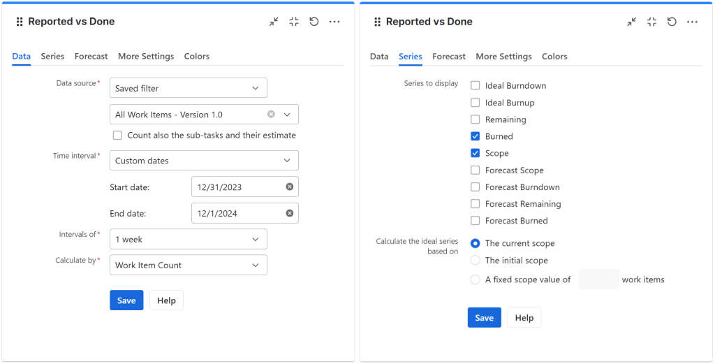 That’s all! Click Save. The gadget should now display the Reported vs Done chart on your Jira dashboard.
