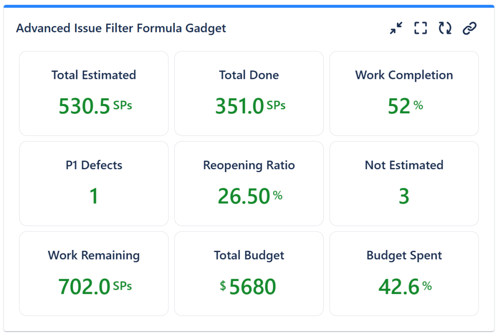 Advanced Issue Filter Formula Gadget – shows the result of up to 9 math formulas (like COUNT, SUM, AVERAGE, MAX, etc) applied against the field of the items from specified filters.