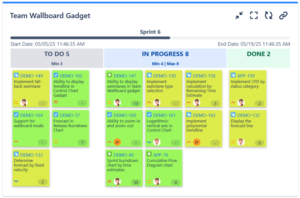 Team Wallboard Gadget – Displays the team task board. On this gadget you can see the items from the current sprint along with their status and assignee. It gives you the overall picture of the sprint contents.