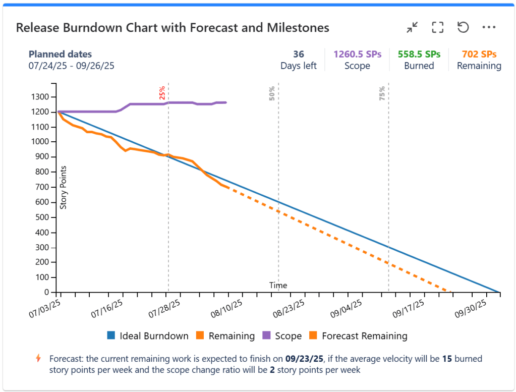 Release Burndown / BurnUp Chart Gadget with Forecast & Milestones – displays the burndown or burnup chart for the entire release, which helps you to see if the project is on track or not. In addition, it can do a prediction (forecast) about the release ETA based on the current or expected team velocity. Optionally, you can choose to display the milestones of the release, like for example at 25%, 50%, 75% of the release timeframe. A past milestone will be displayed in red color, if the Remaining work at that time was higher than Ideal or in green color if it was lower, thus indicating if the milestone was reached or not.