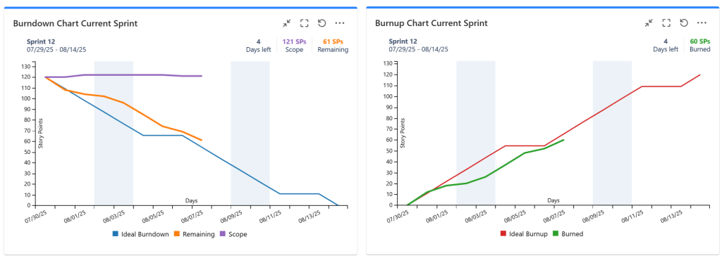 Sprint Burndown / BurnUp Chart Gadget – displays the burndown or burnup chart for your current sprint, which helps you see if the sprint is on track or not.