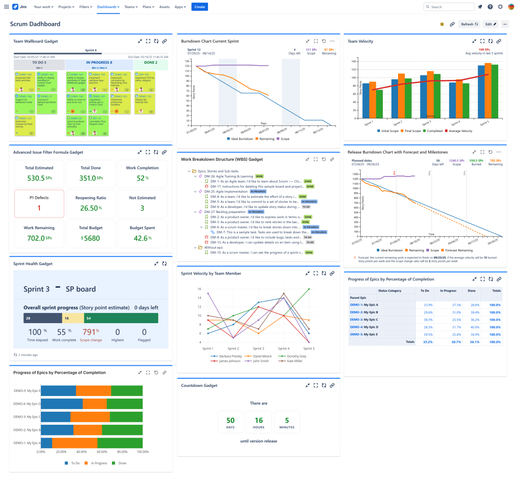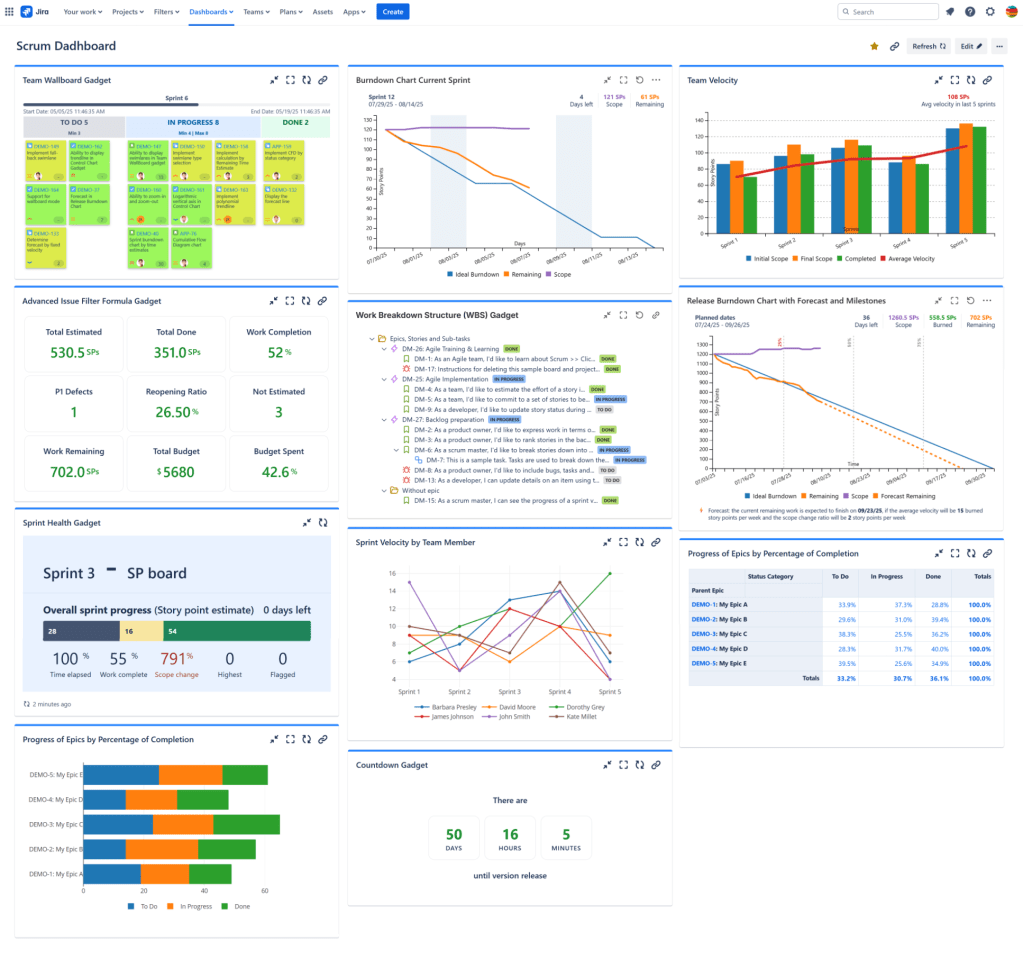Scrum is one of the most popular agile frameworks for software development. Tracking a Scrum project in an effective way is an important task of every Scrum Master or Product Owner. Identifying and then making visible the right metrics needed not only by the team but also by management or other project shareholders can be difficult. In this post we present a list of gadgets that can be used to build a powerful dashboard in Jira for showing the essential metrics, numbers and charts for an ongoing Scrum project.