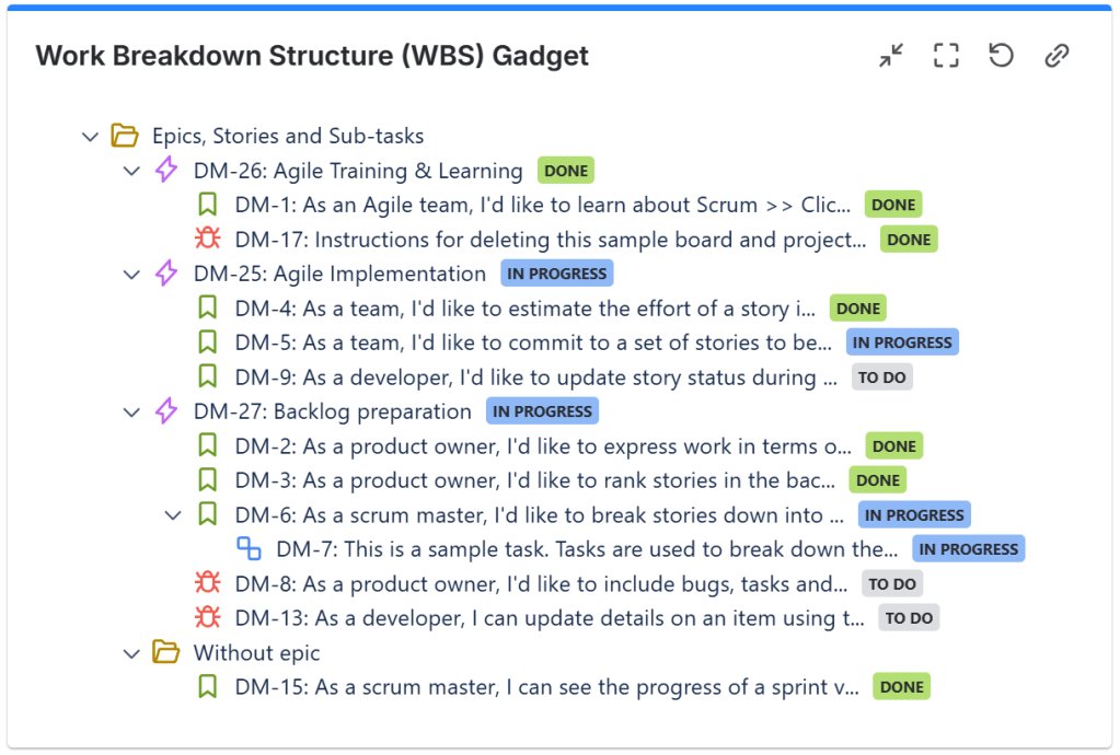 Work Break-down Structure (WBS) – this gadget displays the work items from a filter in a hierarchical form of Epics > Stories > Sub-Tasks along with their current status. You can use this gadget to have an overview over specific epics or over the entire project and to quickly determine what items are still open. It can also display the initiatives defined in Advanced Roadmaps for Jira (formerly Portfolio) on top of the epics.