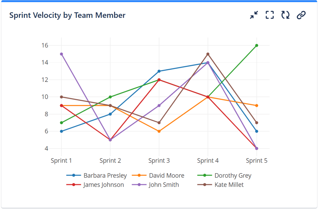 The Pivot Table & Pivot Chart gadget allows you to generate a wide variety of multi-dimensional statistics and visualizations. For example, you can easily create a Sprint Velocity chart by team member, helping you analyze individual contributions across sprints and identify trends in team performance.
