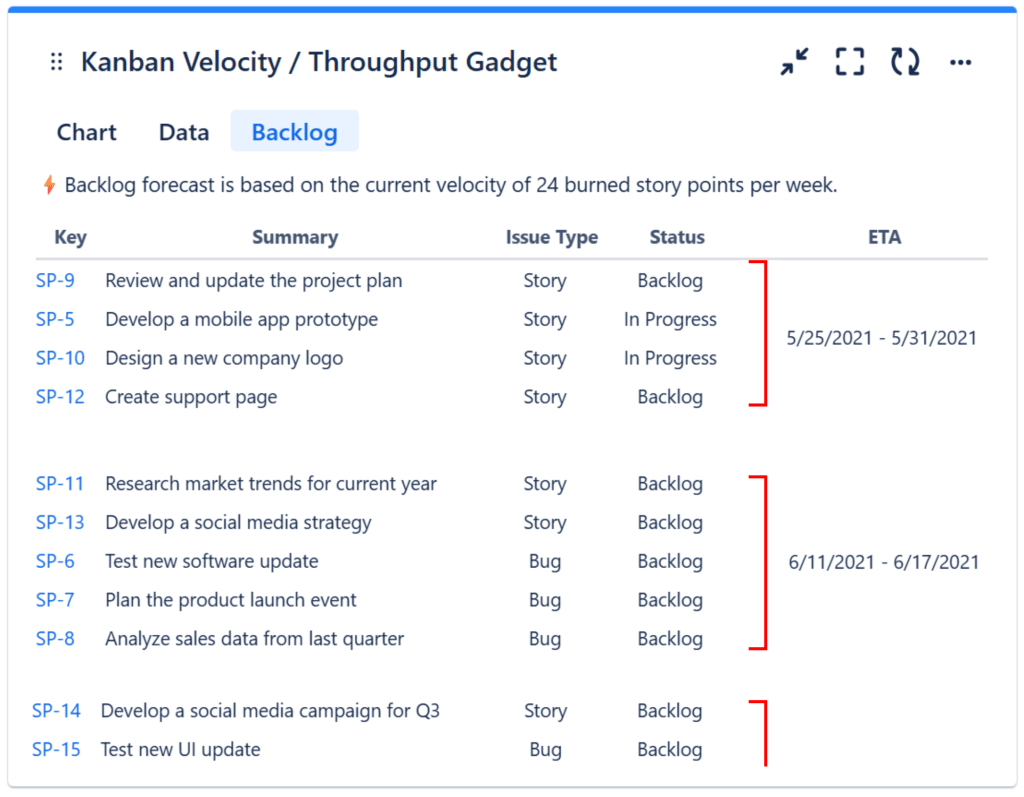 Optionally, this gadget can also do a prediction over the ETA of the issues from the backlog, which helps you answer the difficult customer’s question: “When will my problem be fixed?”