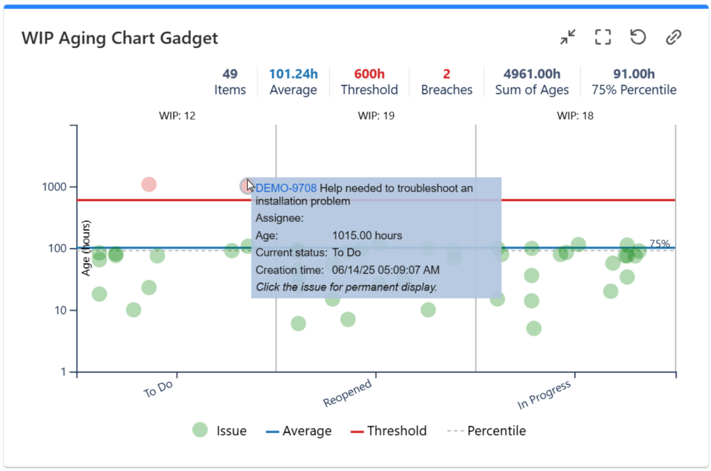 You can use this gadget to easily identify the issues that stay longer than expected in an workflow status. Simply hovering the mouse over an issue from the chart will display a tool-tip with the issue key and its age.