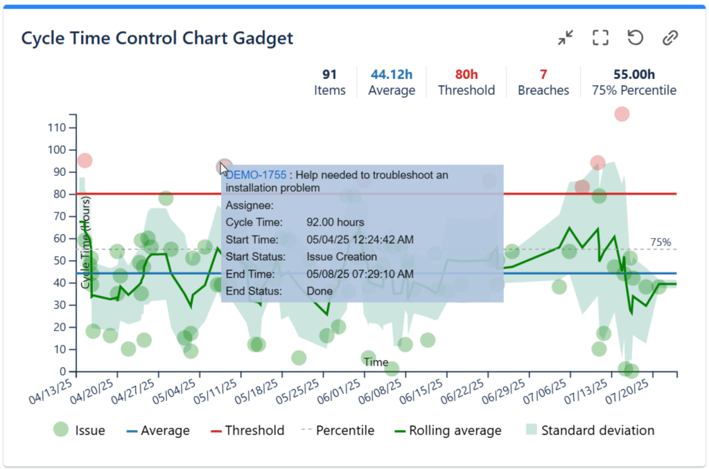 Control Chart Gadget – shows the issues done in a specified time period along with their cycle time in a scatter plot chart. You can use this gadget to identify the issues that took longer than expected – the ones that are over the average time or over the threshold that you set. Simply hovering the mouse over a point from the chart will display a tool-tip with the issue key, cycle time and the date when its cycle was finished.