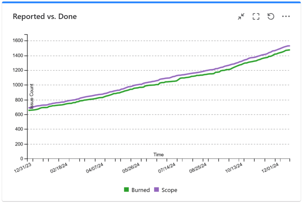 Reported vs Done Chart – Shows the line chart of reported issues and done issues along the time. This chart tells you how your team handles the workload in time. It gives you a clear indication if your team manages to resolve issues fast enough for maintaining the backlog size in acceptable limits.
