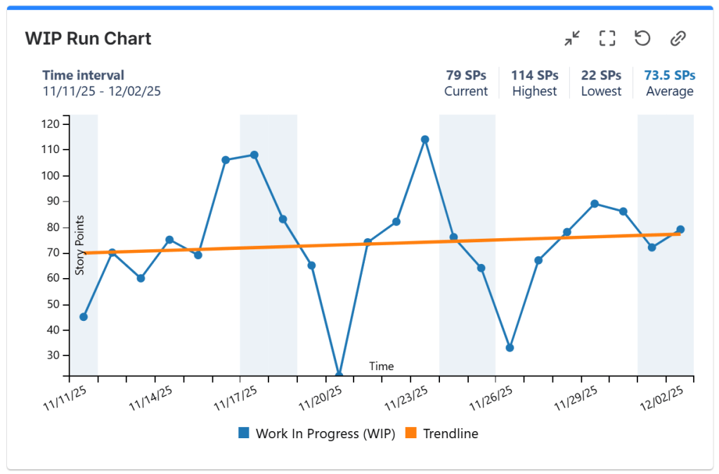 The chart can also display a trend line, which can help you identify the direction and rate of change of your WIP level. This gadget is offered by Great Gadgets app for Jira.