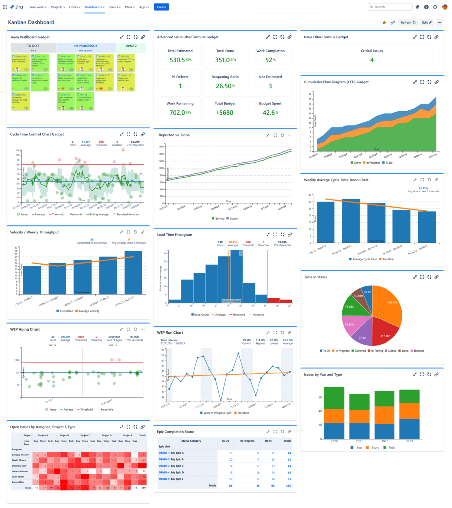 The Great Gadgets app offers all you need to build an effective and powerful dashboard for tracking your Kanban project in a effective way. The app is available on Atlassian Marketplace for Jira Cloud, Server and Data Center, as well as for Confluence Cloud.