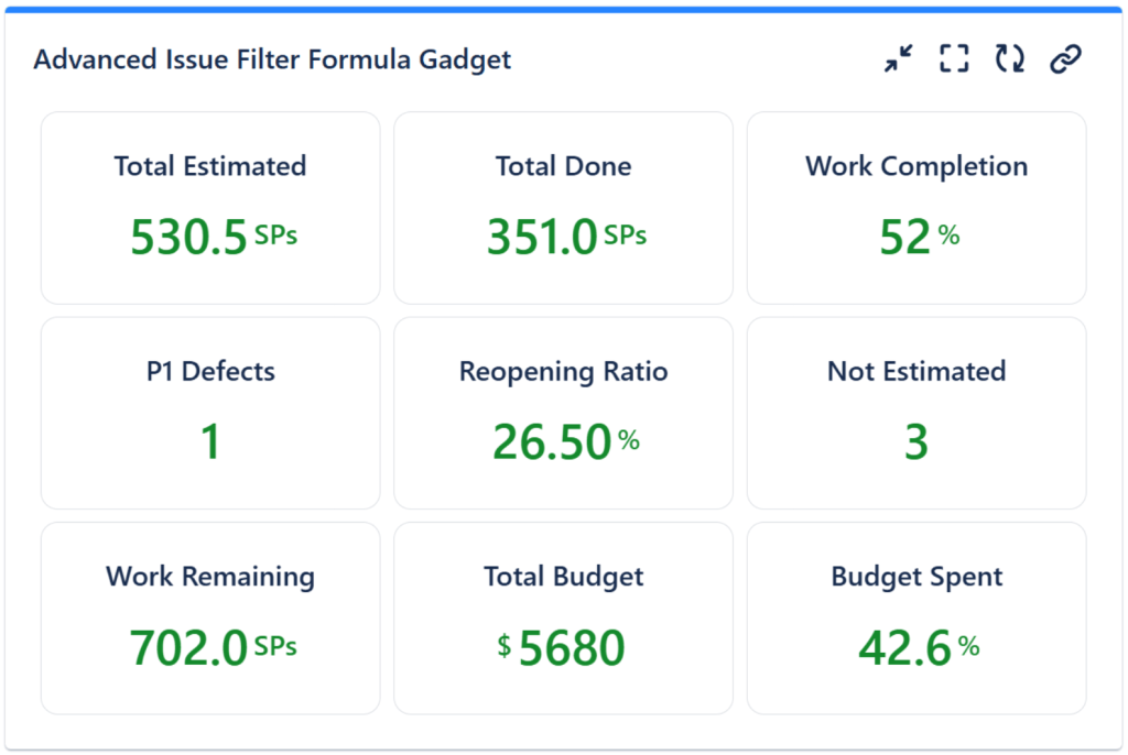 Advanced Issue Formula Gadget – allows displaying up to 9 numbers calculated based on simple or more complex math formulas applied against the fields or count of the issues from multiple Jira filters. You can use this gadgets to display project key-numbers like percentage of work done or issue reopening ratio.