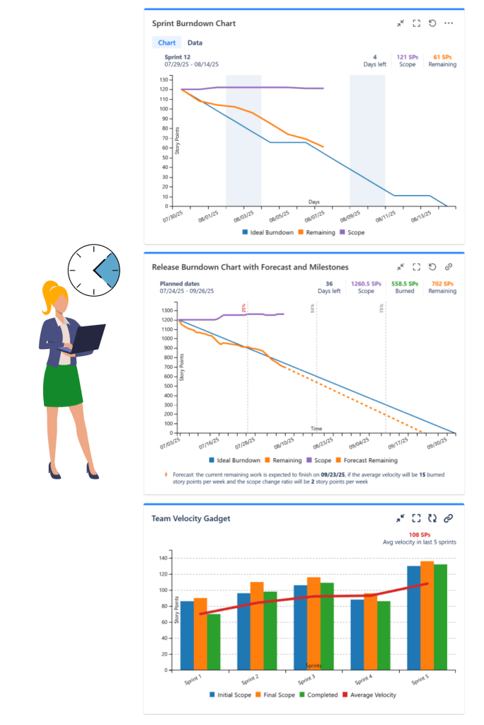 - Great Gadgets for Jira – a gadgets pack for tracking projects in an agile manner. Includes gadgets like sprint and release burndown / burnup charts, team velocity, issue field sum-up, cycle time, work breakdown structure (WBS) and more.
