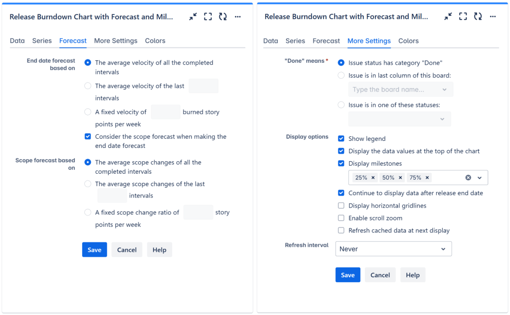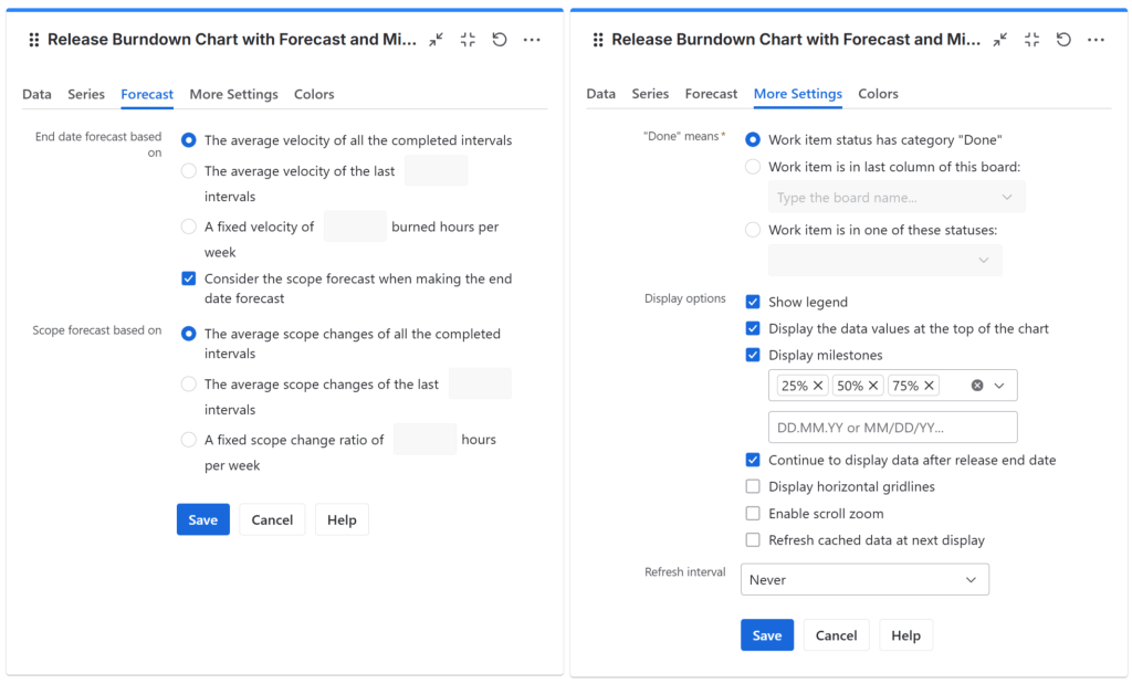 - Choose also what series (lines) to display in the chart. For burndown, select Ideal Burndown, Remaining and Scope. For burnup, select Ideal Burnup and Burned.