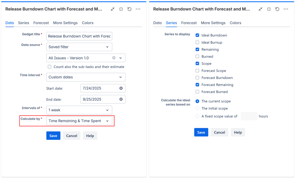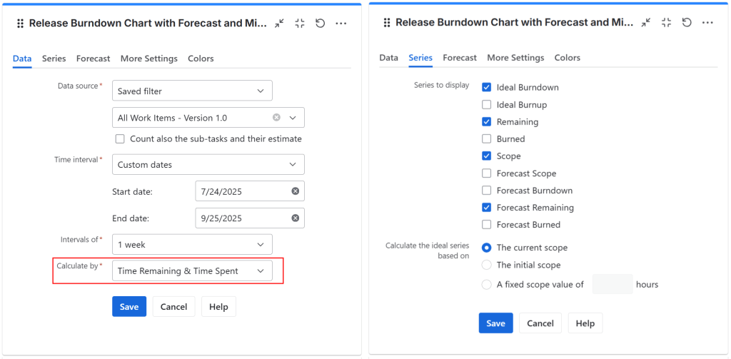 - In the Series tab, choose what series (lines) to display in the chart. For burndown, select Ideal Burndown, Remaining and Scope. For burnup, select Ideal Burnup and Burned.