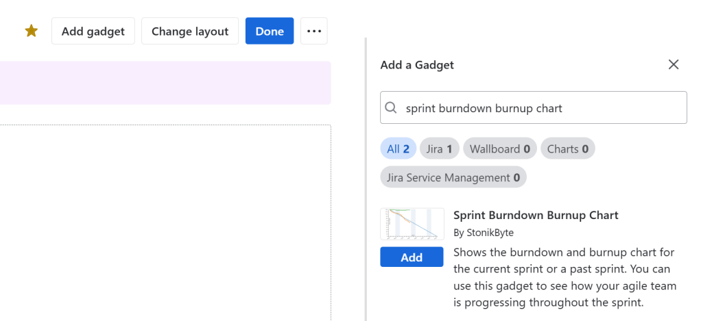 - Add the Sprint Burndown Burnup Chart gadget to your Jira dashboard.