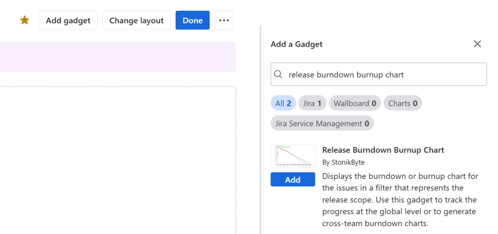 - Add the Release Burnup Burndown Chart gadget to your Jira dashboard.