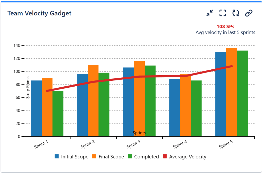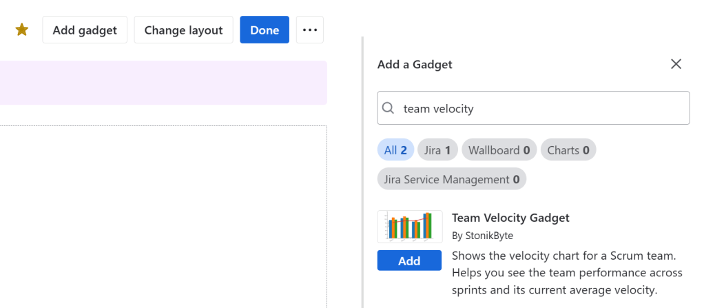 - Add the Team Velocity Gadget Chart gadget to your Jira dashboard.