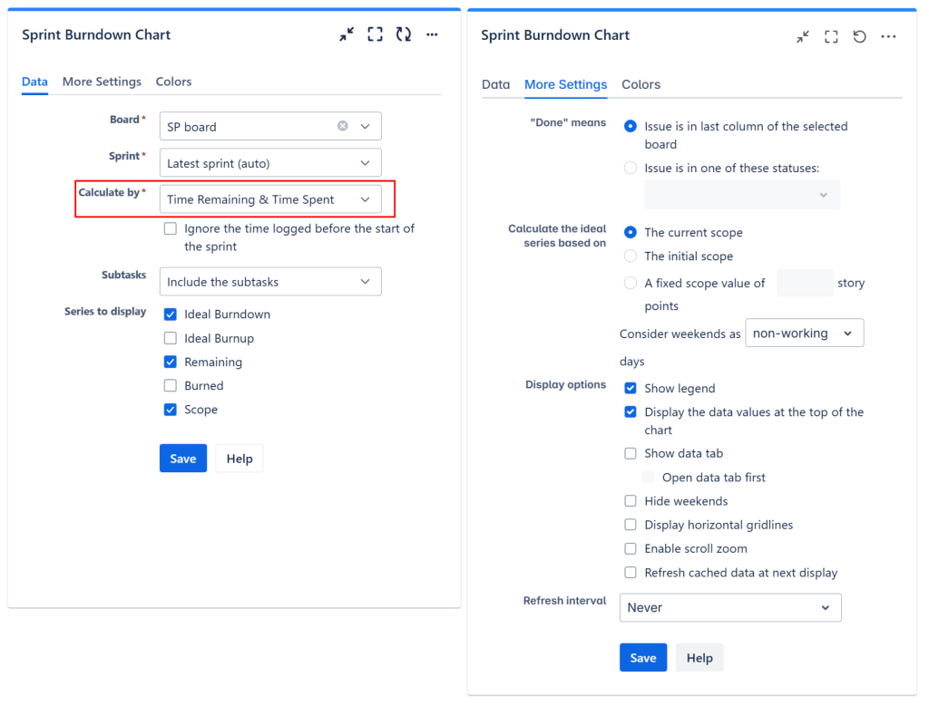- Tracking by Remaining Time & Time Spent. This option uses Remaining Time and Time Spent of the issues; it does not consider the Original Estimate field. When using this option, the Current Scope of the project (total estimated work) is calculated as the sum of the Time Spent field plus the sum of Remaining Time of all the issues from the Jira project or sprint. Burned (or completed work) is calculated as the sum of the Time Spent field of all the issues plus the sum of the Remaining Time field of the issues that are “done”. Remaining (or remaining work) is Current Scope minus Burned.