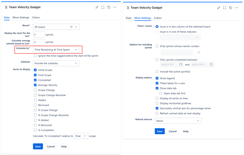 - Start configuring the gadget by selecting your Scrum Board and the number of past sprints to be displayed and used for calculating the average velocity.