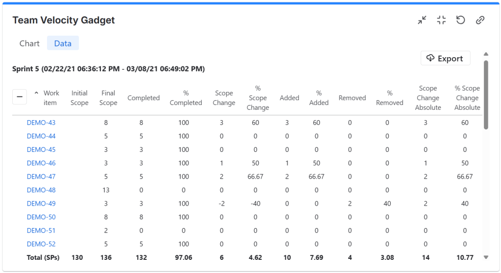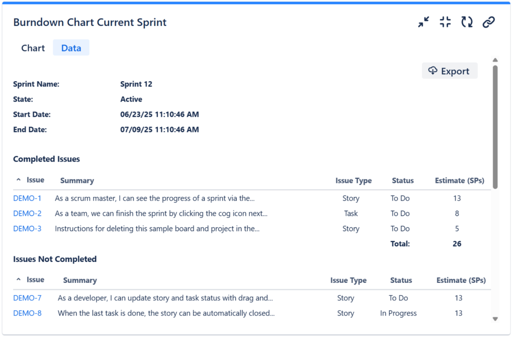 - If you checked Show data table in the More Settings tab, the gadget will display a Data tab with a nice sprint report that you can easily export in CSV format.