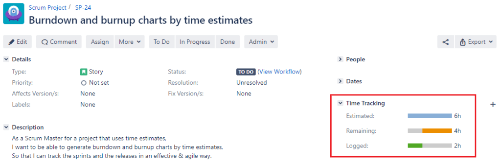 Original Estimate – represents the total time estimate of the Jira issue. It is usually set at the issue creation or right after, but can be adjusted later, during the project.