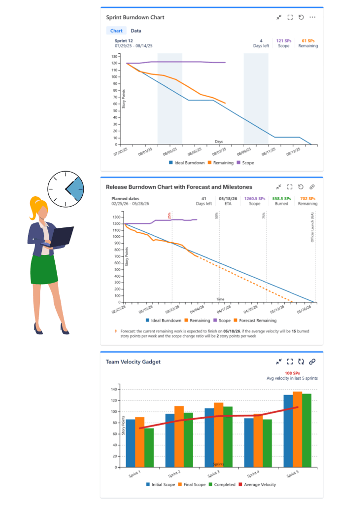 - Great Gadgets for Jira – a gadgets pack for tracking projects in an agile manner. Includes gadgets like sprint and release burndown / burnup charts, team velocity, issue field sum-up, cycle time, work breakdown structure (WBS) and more.