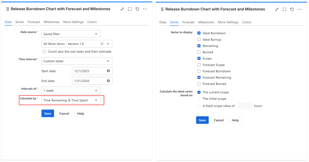 - In the Series tab, choose what series (lines) to display in the chart. For burndown, select Ideal Burndown, Remaining and Scope. For burnup, select Ideal Burnup and Burned.