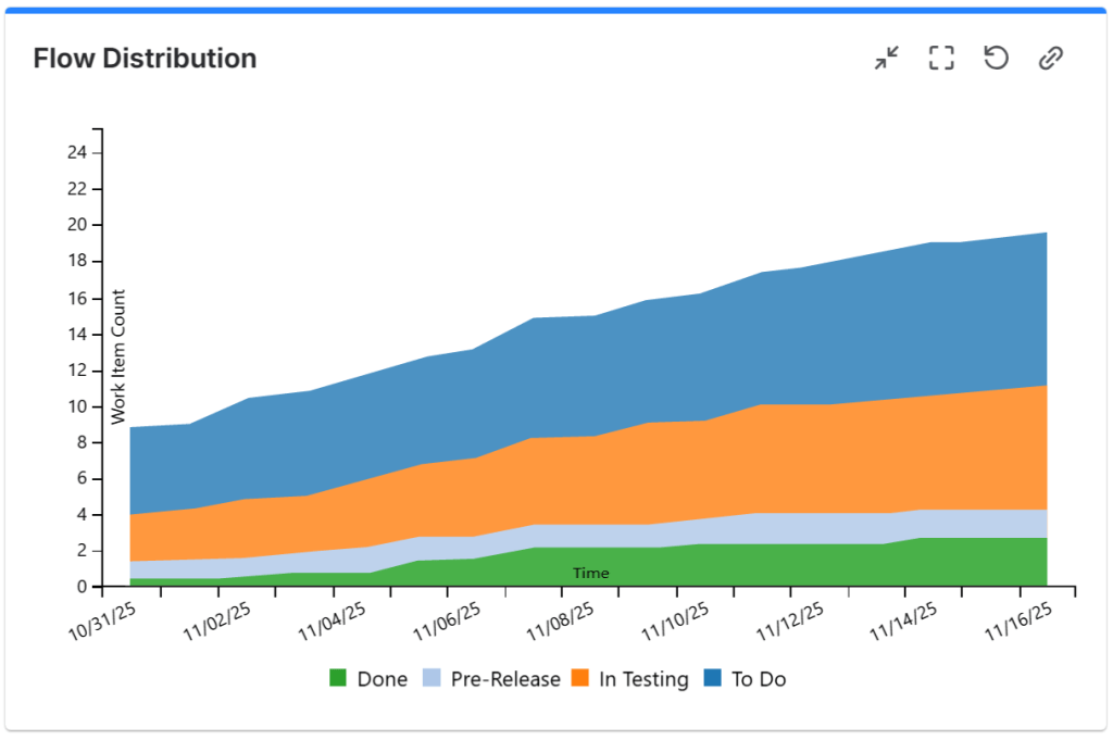 This chart presents the amount of each type of work (stories, bugs, enablers, etc.) along the release. Flow distribution is a standard metric in SAFe®.