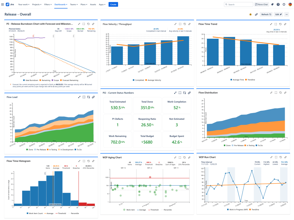 This chart calculates the total time the issues took to go through the workflow and displays the distribution of the values as a series of bars in the form of a histogram. It helps you determine how fast the issues are resolved, the average flow time, and how many issues had their flow time in acceptable ranges and how many did not. Flow Time is a standard metric in SAFe®. It is useful to display on both release and team-specific dashboards.