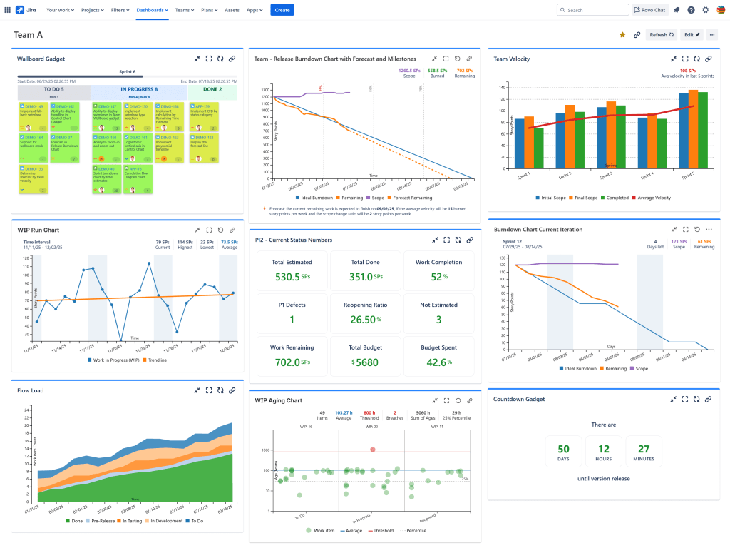 You can add this chart by using the Cumulative Flow Diagram (CFD) gadget offered by Great Gadgets app. All you have to do is to create a filter in Jira for the entire release and a filter for each specific team and then configure the gadgets to use them. For the release dashboards, the bands should be generated by issue statuses or by issue status categories. For the team-specific dashboards, it should be configured to generate the bands based on the columns of the team’s agile board. It’s up to you how the numbers will be calculated: by issue count, story points or other criteria.