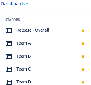 Our recommendation is to create one dashboard for tracking the overall release, and one dashboard for every team that works on that release.