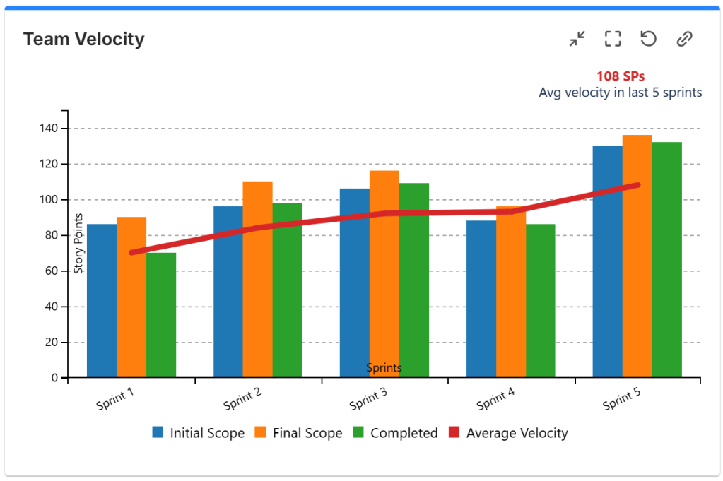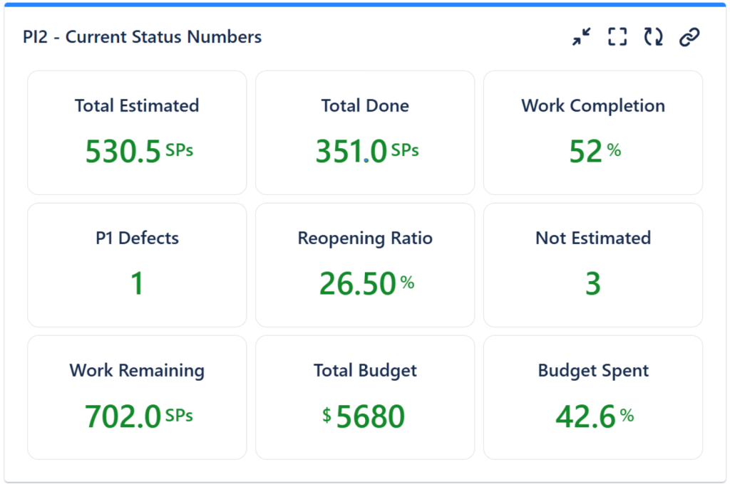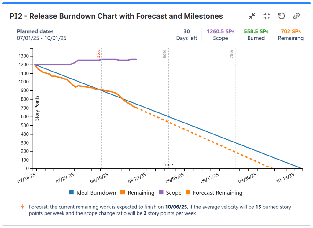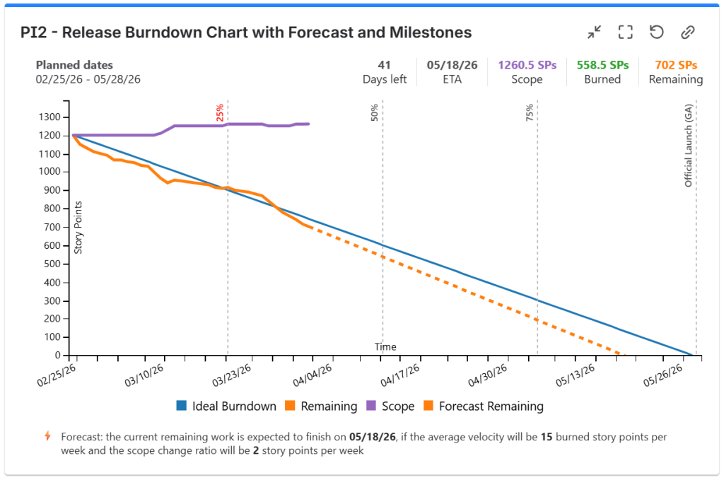This chart displays the burndown chart for the entire release. It shows the current scope (total amount of work planned) and the current remaining work vs. expected remaining work (ideal line) indicating if the release is on track or not. It is an essential chart for tracking the overall progress of your release or ART, so this is a “must” for your release dashboard. You should also add this to the team-specific dashboards, but to configure it to display only the data of that specific team.