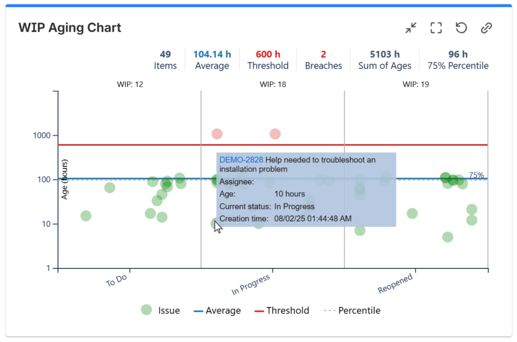 This chart can be displayed by using the WIP Aging Chart gadget offered by Great Gadgets app. Also, it allows specifying a threshold line to identify those issues that have an age that exceeds the acceptable value.