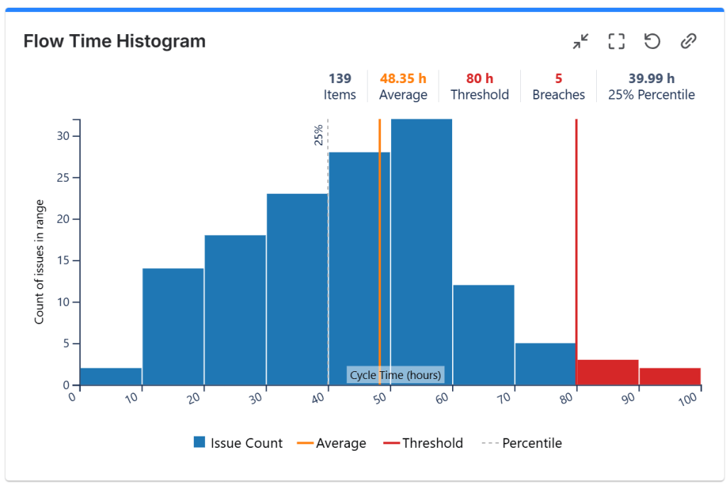 This chart calculates the total time the issues took to go through the workflow and displays the distribution of the values as a series of bars in the form of a histogram. It helps you determine how fast the issues are resolved, the average flow time, and how many issues had their flow time in acceptable ranges and how many did not. Flow Time is a standard metric in SAFe®. It is useful to display on both release and team-specific dashboards.