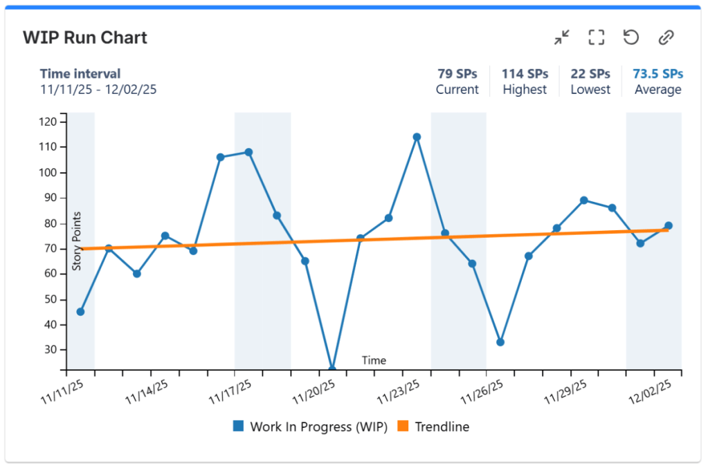 You can display this chart on your dashboards by using the WIP Run Chart gadget offered by Great Gadgets app for Jira. This chart can also display a trend line, which can help you identify the direction and rate of change of your WIP level.