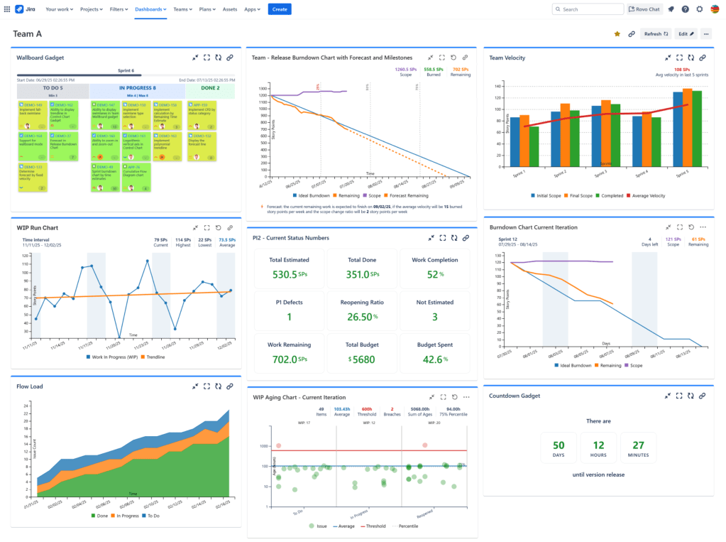 You can add this chart by using the Cumulative Flow Diagram (CFD) gadget offered by Great Gadgets app. All you have to do is to create a filter in Jira for the entire release and a filter for each specific team and then configure the gadgets to use them. For the release dashboards, the bands should be generated by issue statuses or by issue status categories. For the team-specific dashboards, it should be configured to generate the bands based on the columns of the team’s agile board. It’s up to you how the numbers will be calculated: by issue count, story points or other criteria.