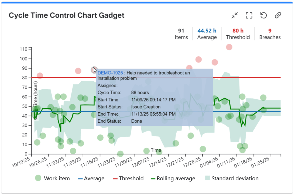 Hovering over the issues in the chart will give you insightful details about it, like issue summary and its cycle duration, so you can intervene and investigate further.