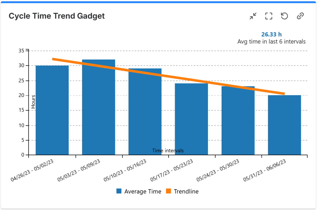 The Cycle Time Trend gadget offered by the Great Gadgets app displays the overall average cycle time or average lead time, for the past time intervals, along with a linear or polynomial trend-line.