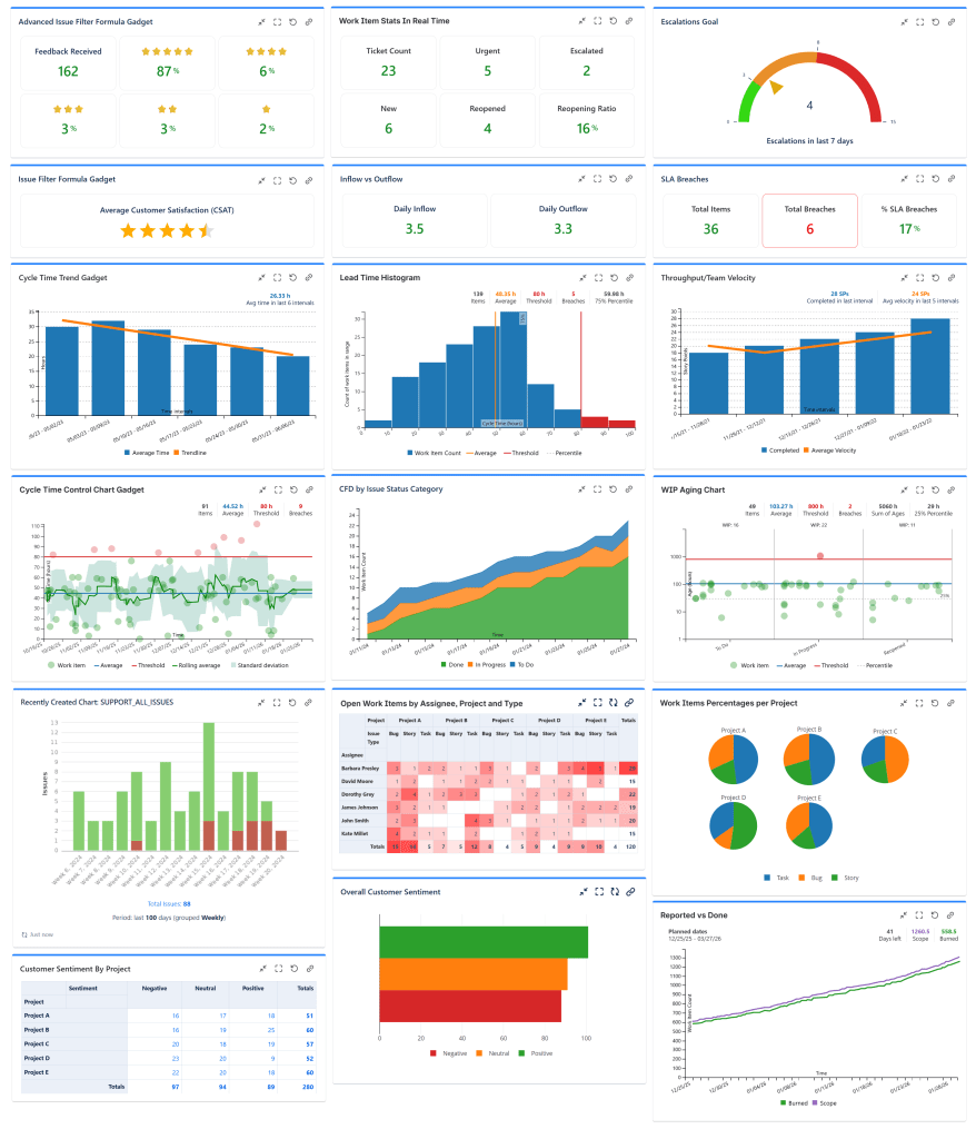 Our recommended way of tracking these metrics is by creating dashboards in Jira with all the necessary gadgets, which are provided by Jira itself and the Great Gadgets app. As an alternative to the Jira dashboards, you could create report pages in Confluence with the macros provided by the same Great Gadgets app.