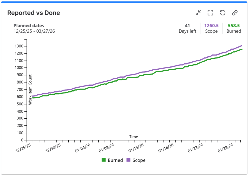 It displays a bar chart with the number of issue done by your team as well as the rolling average and current velocity of the team. This way you can see the trend and how the team productivity evolved along the time.