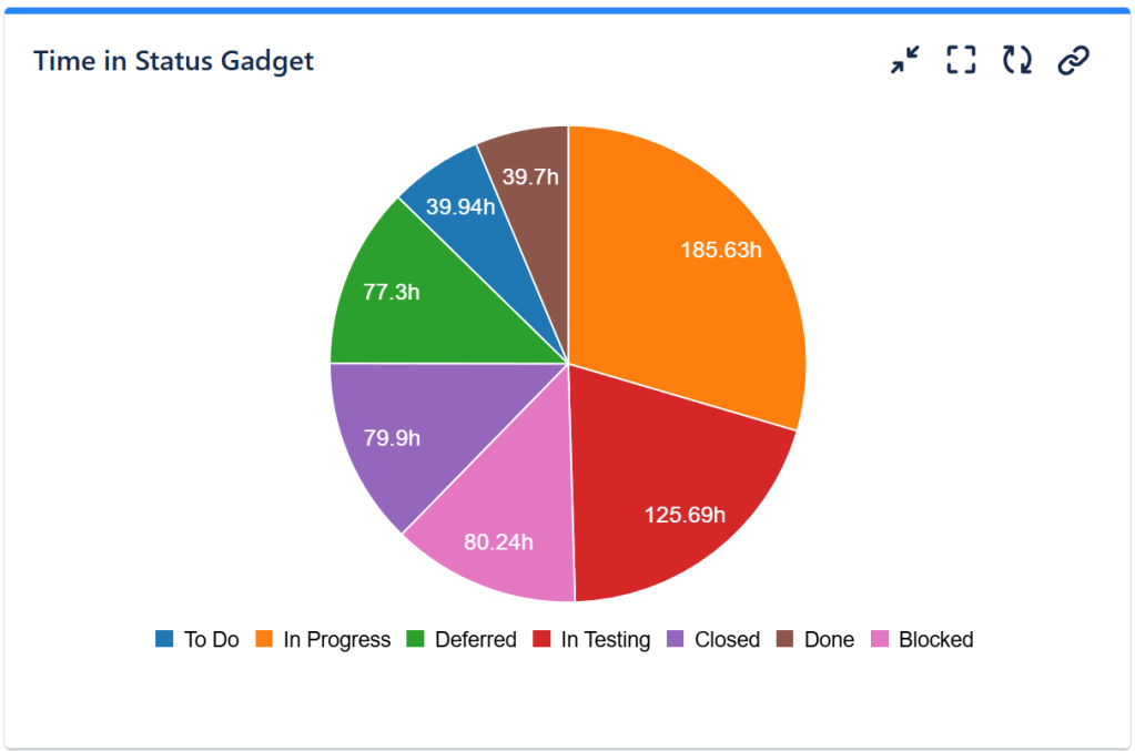 Time In Status Gadget – this is another useful gadget offered by Great Gadgets app which can easily calculate and display how long issues stayed in each workflow status, status category, or board column. The results can be displayed as a pie chart, bar chart, or line chart.