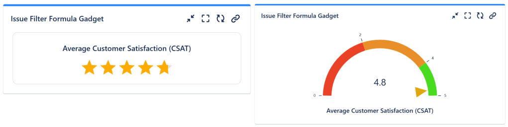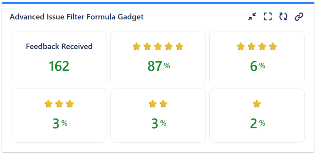Also, with the Advanced Issue Filter Formula gadget offered by the Great Gadgets app, you can display many other stats related to the Satisfaction field of Jira Service Management.