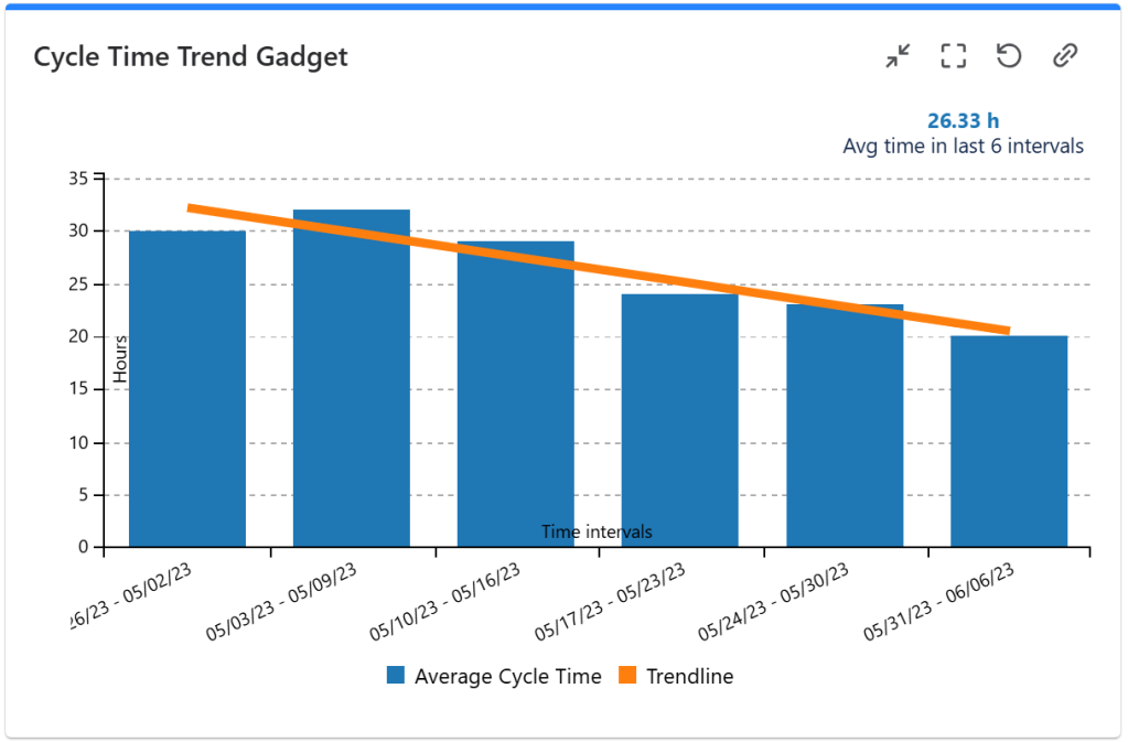 The Cycle Time Trend gadget offered by the Great Gadgets app displays the overall average cycle time or average lead time, for the past time intervals, along with a linear or polynomial trend-line.
