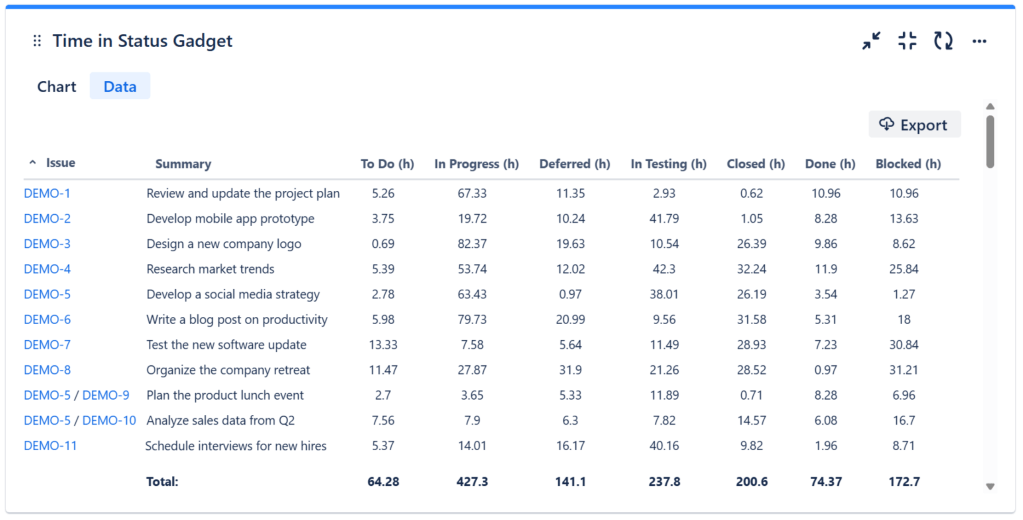 Additionally, it provides a data tab, with details about the time spent in every status, for each individual issue, that can be easily exported in CSV format.