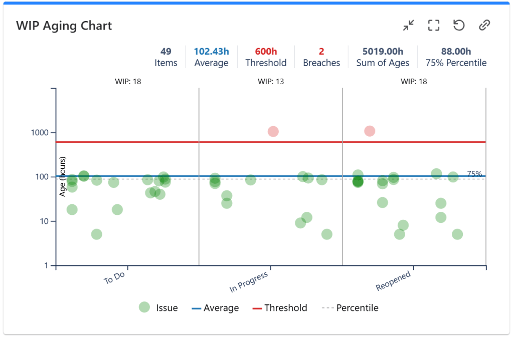 By setting a custom threshold, you can easily identify those issues that stay too long in their current status. Hovering over an issue in the chart, will give you insightful details about it, like summary and its age (time in status).