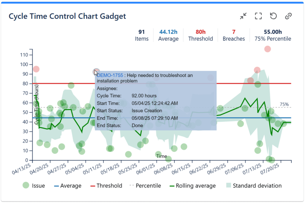 Hovering over the issues in the chart will give you insightful details about it, like issue summary and its cycle duration, so you can intervene and investigate further.