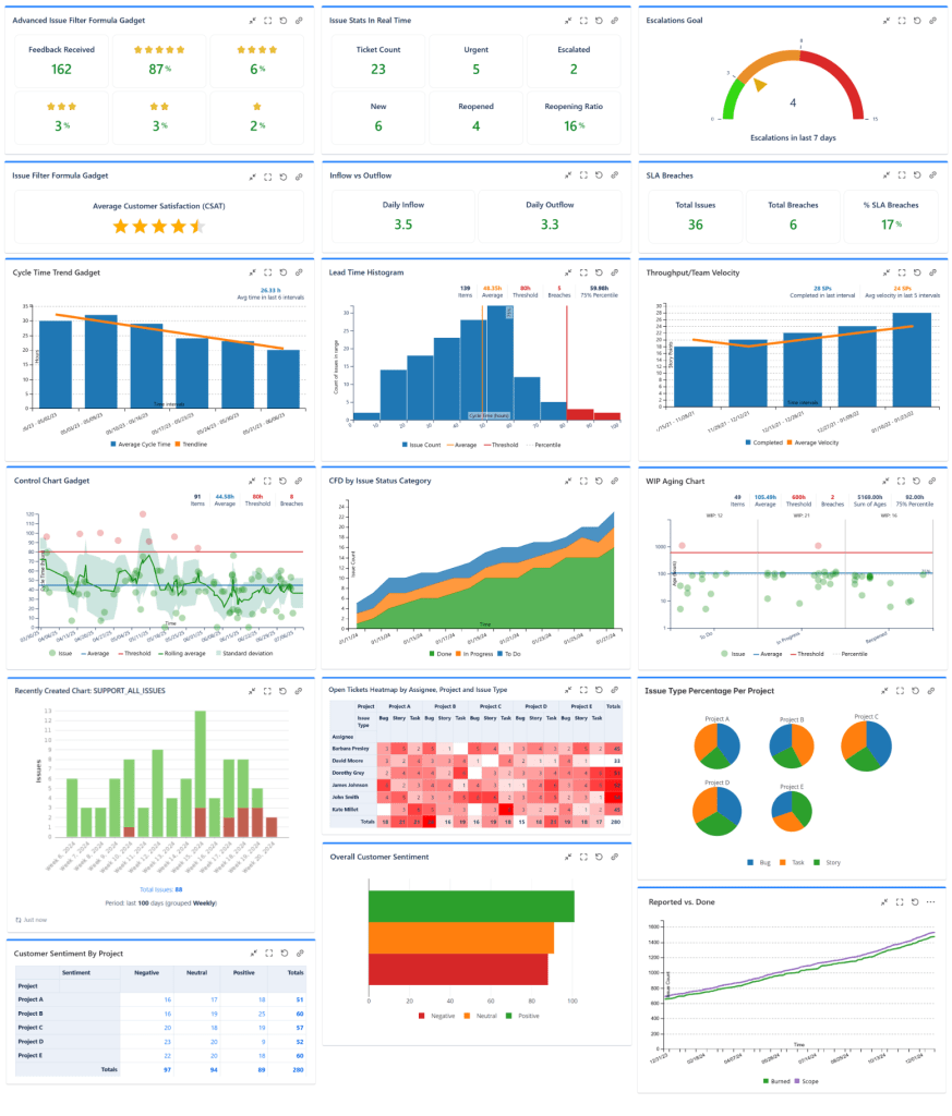 Our recommended way of tracking these metrics is by creating dashboards in Jira with all the necessary gadgets, which are provided by Jira itself and the Great Gadgets app. As an alternative to the Jira dashboards, you could create report pages in Confluence with the macros provided by the same Great Gadgets app.