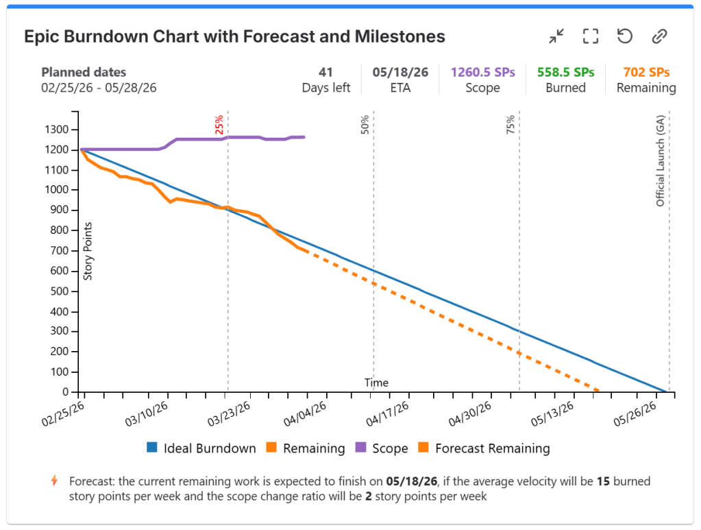 With the Release Burndown Burnup Chart from Great Gadgets you can create a comprehensive epic burndown chart for your projects.