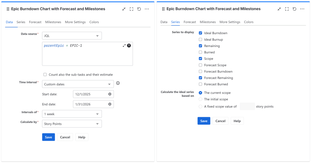 - To configure the gadget as an epic burn-up chart, just choose to display Ideal Burnup, Burned and Forecast Burned series.